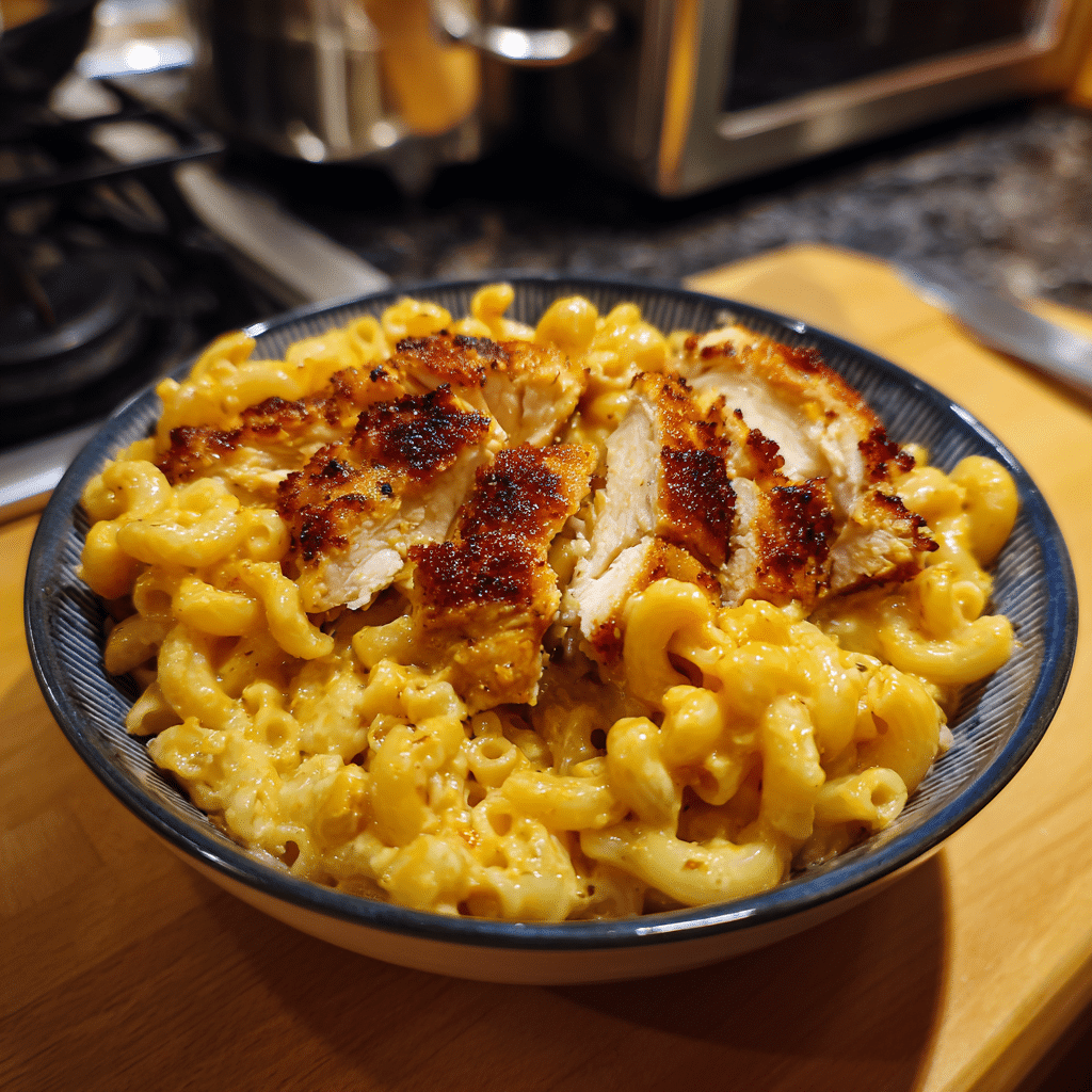 Creamy, cheesy macaroni and cheese topped with tender BBQ chicken, creating a comforting dish with the perfect balance of smoky, savory, and cheesy flavors.