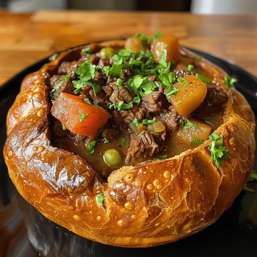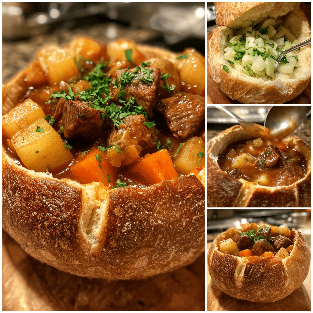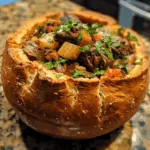 This recipe brings the warmth of a classic beef stew together with the fun, rustic presentation of a bread bowl. It’s perfect for chilly evenings, family dinners, or when you want to impress guests with something hearty yet cozy. The slow-simmered beef becomes melt-in-your-mouth tender, and the bread bowl adds an extra layer of comfort — no need for extra plates!