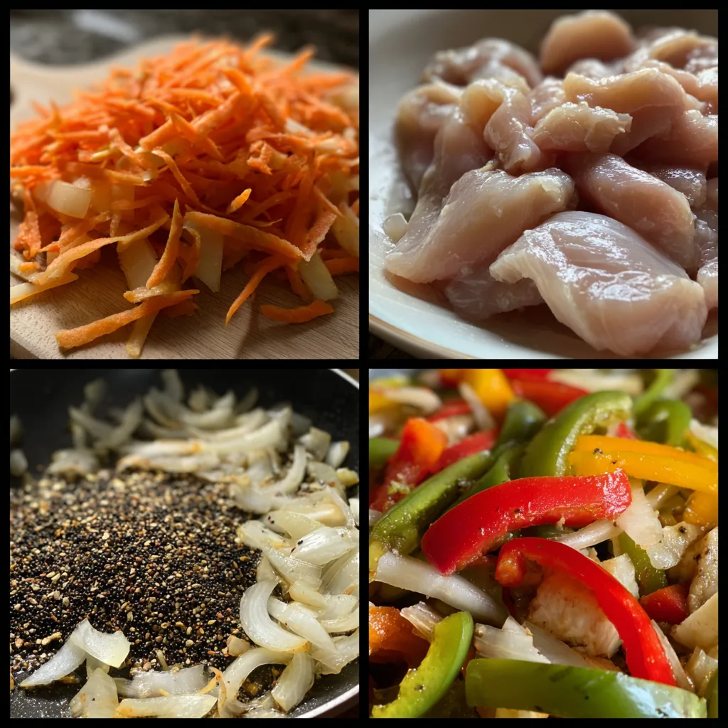 While the chicken marinates, prepare the vegetables. Slice the onion and bell peppers into thin strips and mince the garlic. Having everything ready before cooking is important because stir-frying happens quickly.