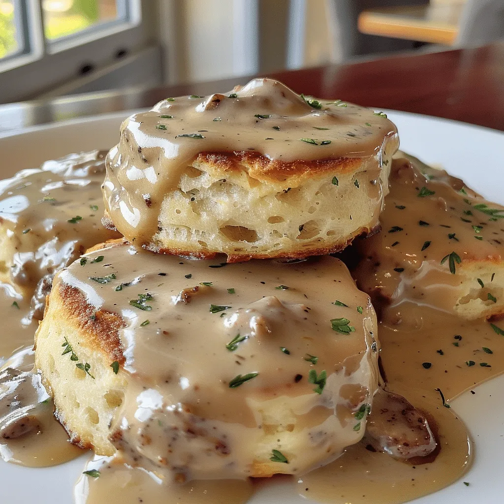 - Split the warm biscuits and spoon the sausage gravy generously over the top. Serve immediately.
