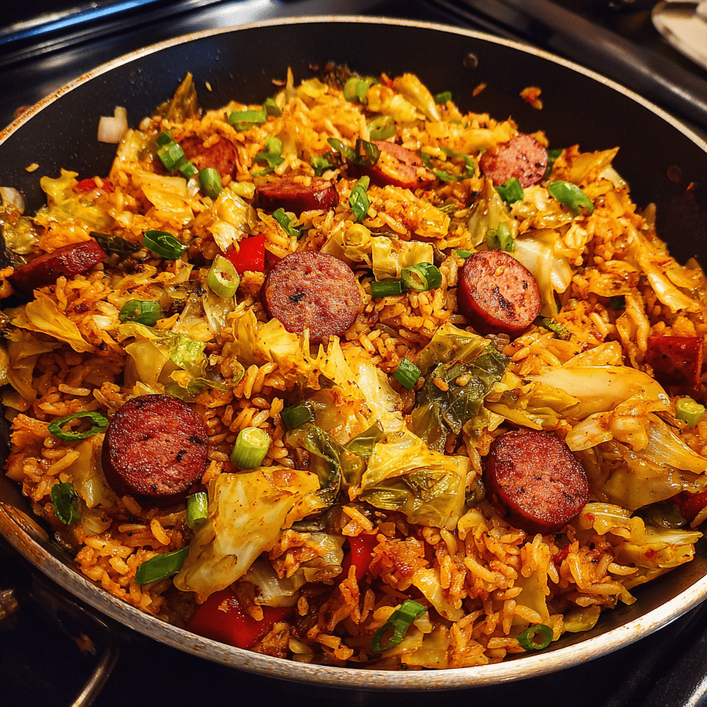 A hearty Cajun-inspired dish made with tender cabbage, seasoned rice, smoked sausage, and spices, creating a flavorful one-pot jambalaya twist without tomatoes.