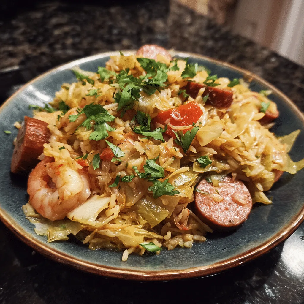 A hearty Cajun-inspired dish made with tender cabbage, seasoned rice, smoked sausage, and spices, creating a flavorful one-pot jambalaya twist without tomatoes.