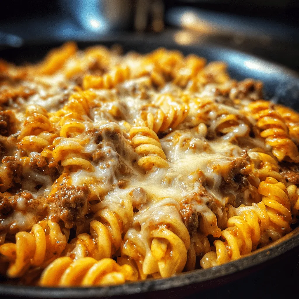 Ground turkey or chicken can replace beef for a lighter version. For a baked variation, top with extra mozzarella and bake until golden and bubbling. You can also switch rotini for penne or fusilli without affecting the final result.