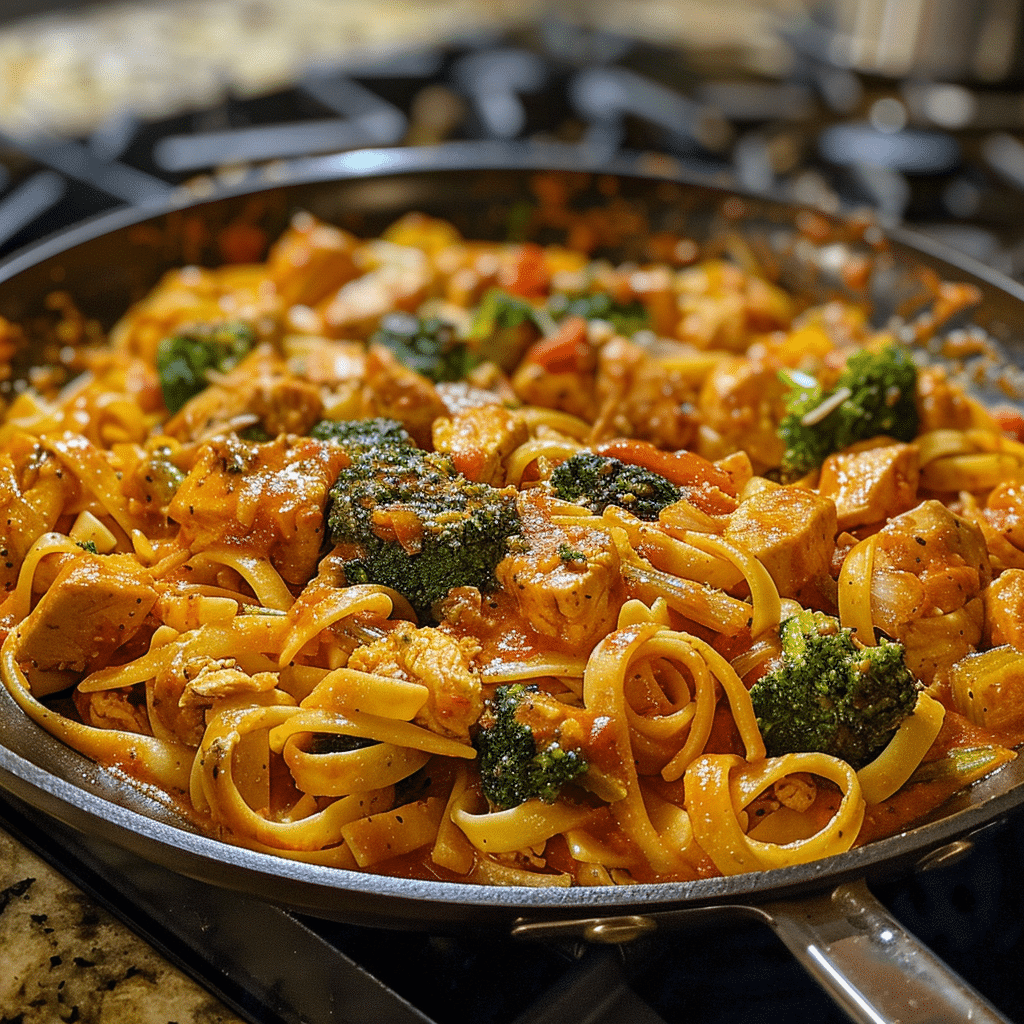 - Return the chicken, pasta, and broccoli to the skillet. Toss until evenly coated with sauce.