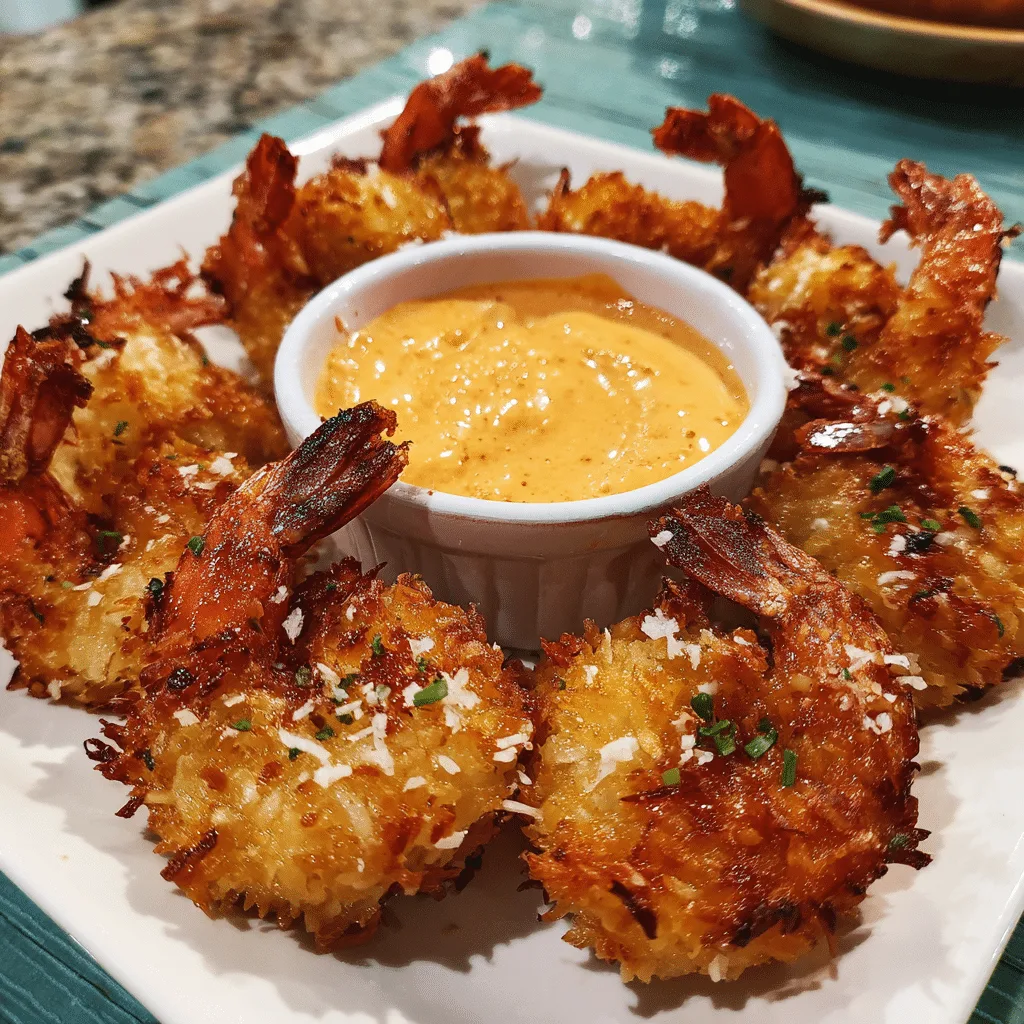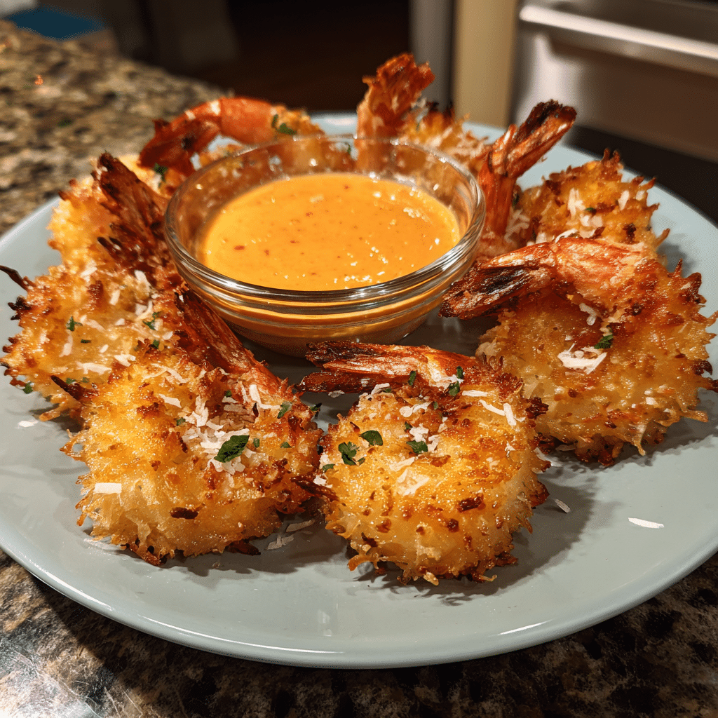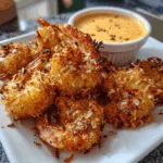 Crispy golden coconut-coated shrimp served with a creamy sweet chili mayo dipping sauce—perfect as an appetizer or party snack.