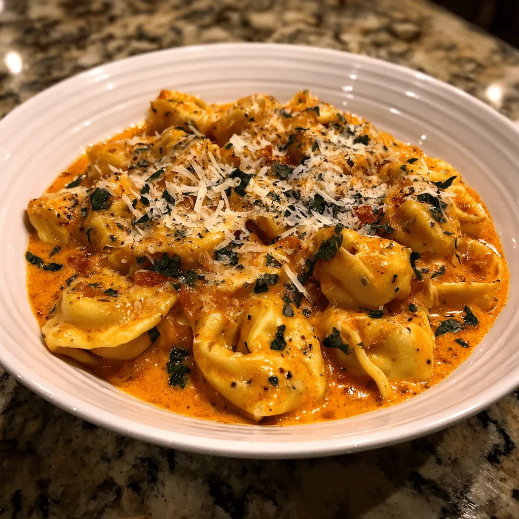 Heavy cream softens the acidity of the tomatoes, transforming the sauce into a silky blend that coats the tortellini luxuriously.