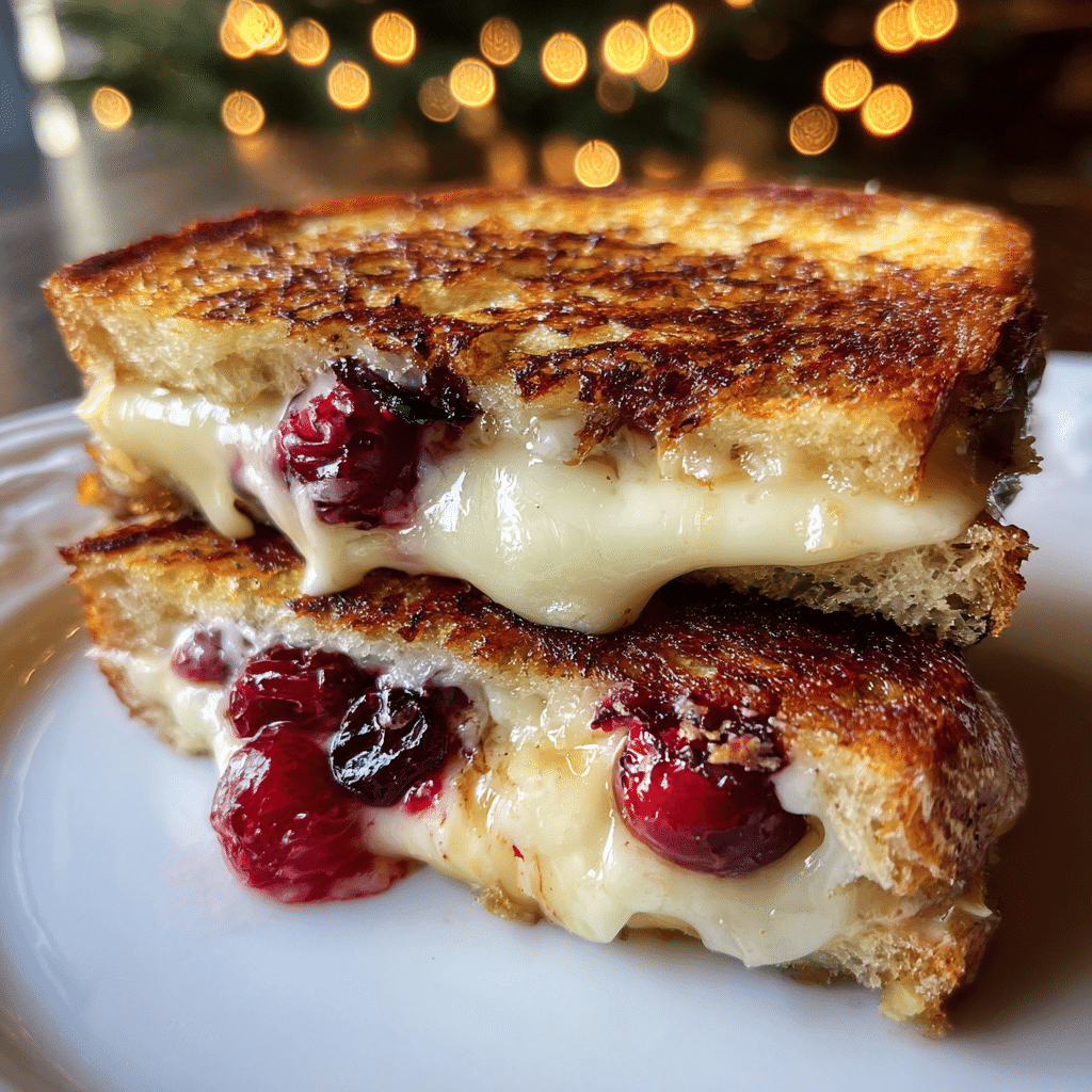 A gourmet grilled sandwich filled with melty brie, gooey mozzarella, and tangy cranberry sauce, perfectly toasted for a sweet and savory bite.