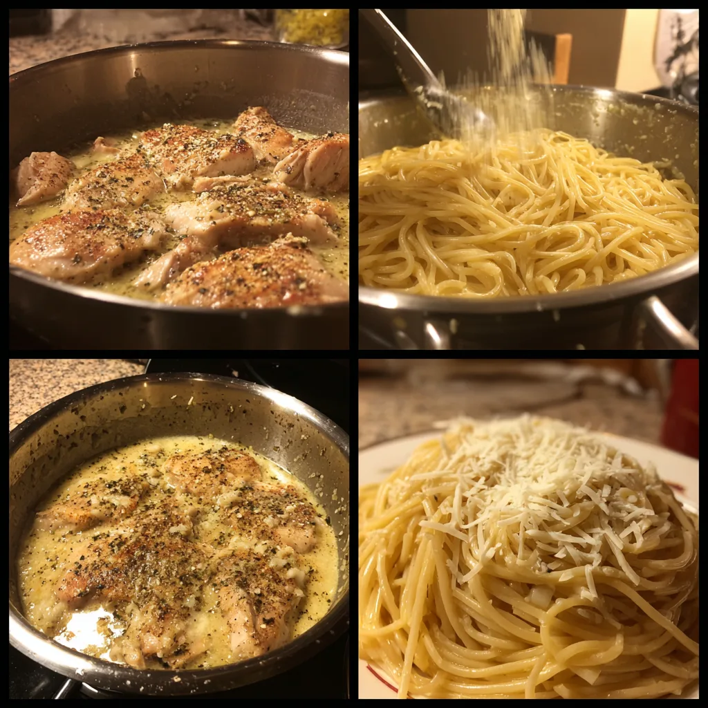 Return the cooked chicken to the skillet and mix well. Add the drained spaghetti, tossing everything together until evenly coated. If the sauce seems too thick, add a splash of reserved pasta water to loosen it. Taste and adjust seasoning before serving warm.