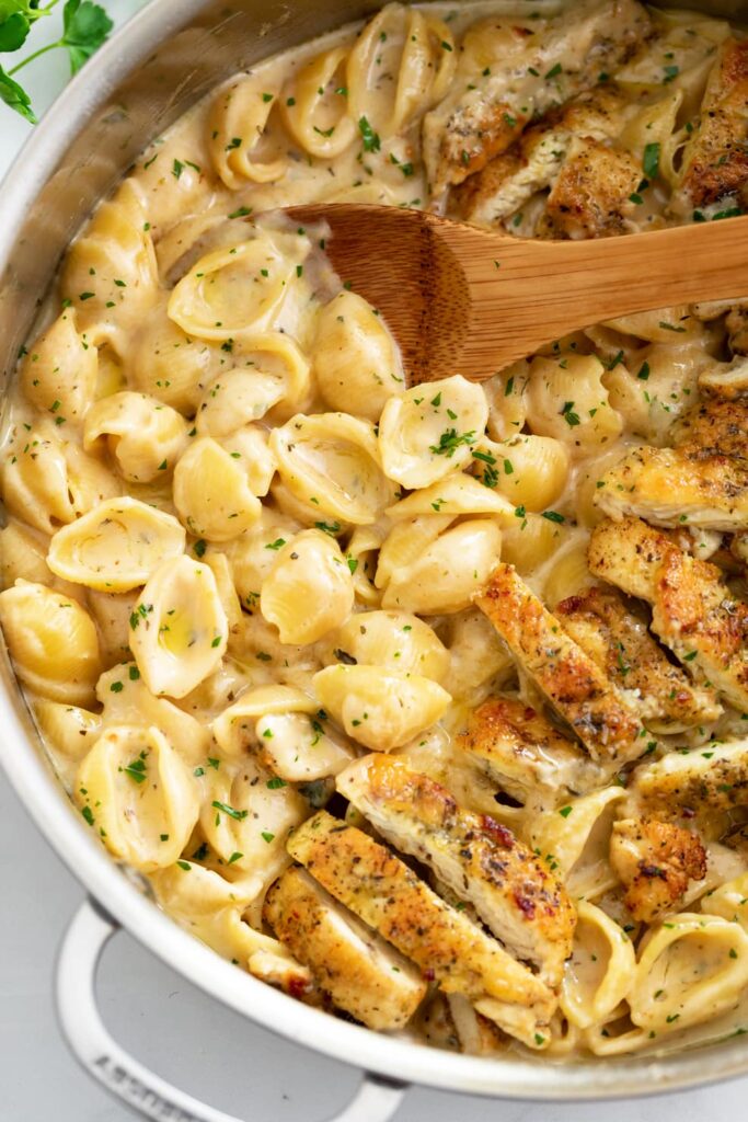 Pasta acts as the base of the dish and carries the creamy sauce. Penne, fettuccine, or rigatoni are excellent choices because they hold the sauce well.