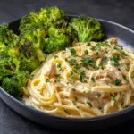 Creamy Parmesan chicken spaghetti tossed in a rich garlic cream sauce and served with tender roasted broccoli for a comforting and flavorful meal.
