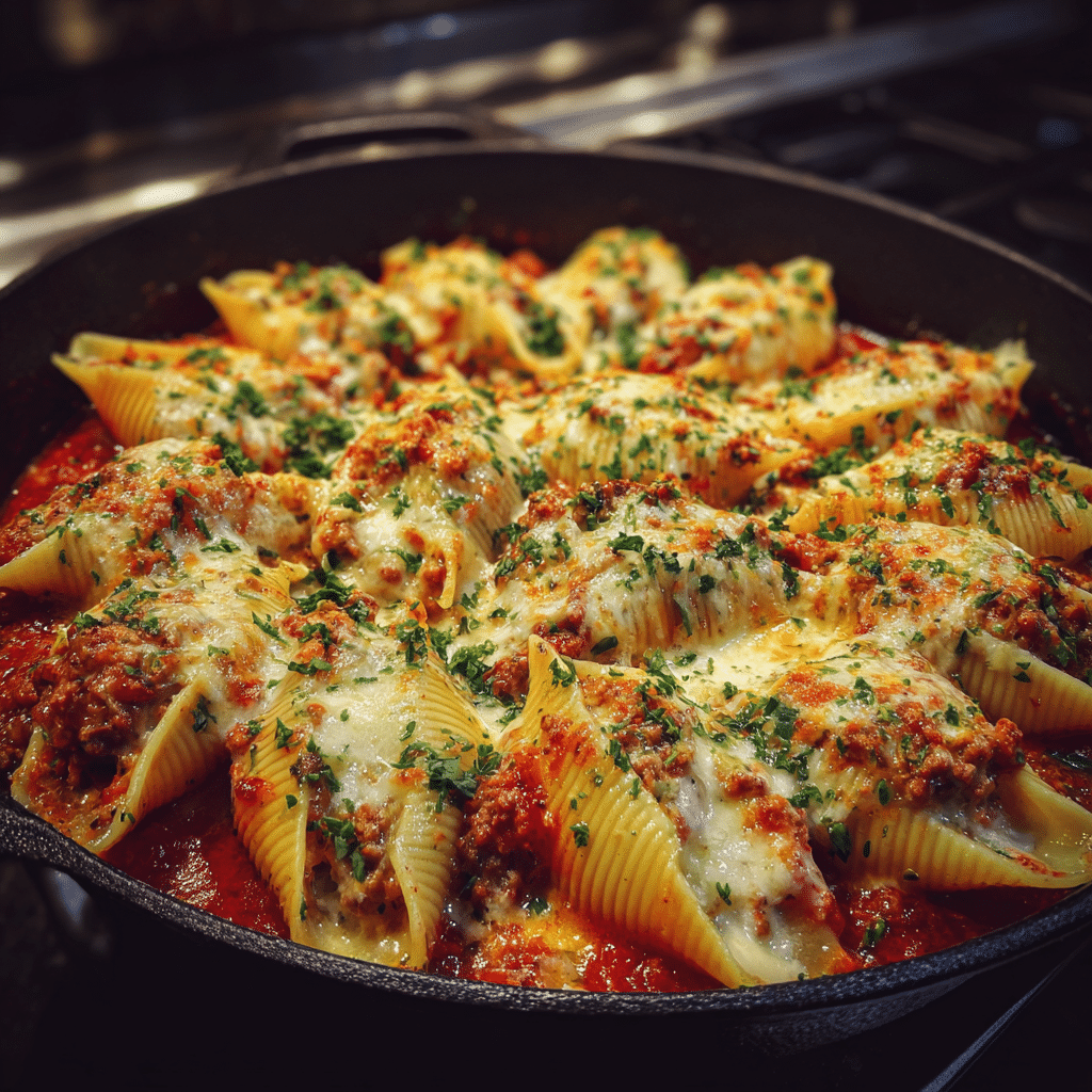 Large pasta shells stuffed with a creamy ricotta and beef mixture, topped with marinara and melted mozzarella for a comforting and cheesy baked pasta dish.