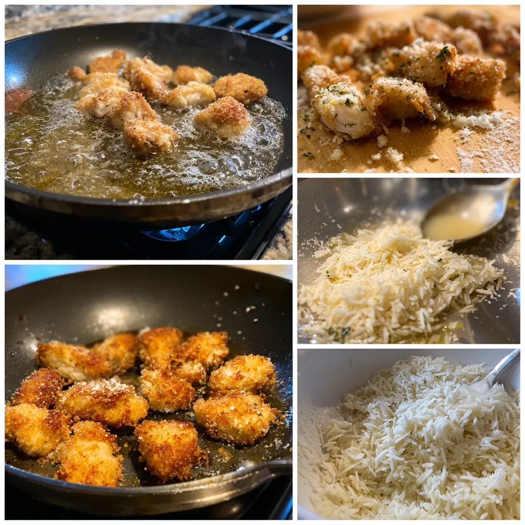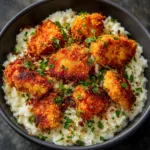 Crispy Chicken Bites with Creamy Garlic Parmesan Rice is a comforting and flavorful dish featuring golden, crunchy chicken pieces served over rich, creamy rice infused with garlic and Parmesan cheese.