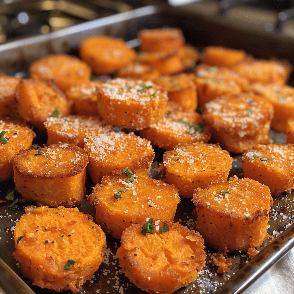 Bite-sized roasted sweet potato cubes that are crispy on the outside and tender on the inside, seasoned to perfection for a delicious appetizer or side dish.