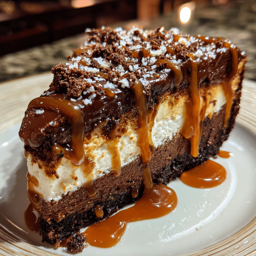 An indulgent dessert that combines fudgy brownies, rich caramel, and creamy cheesecake layers into one decadent treat, perfect for special occasions.