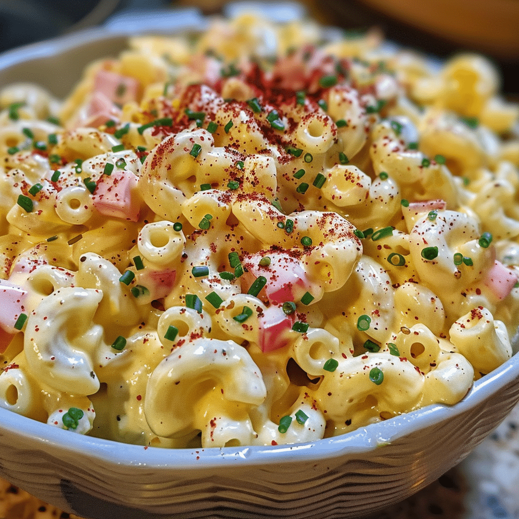 A creamy and flavorful Deviled Egg Macaroni Salad that combines the classic taste of deviled eggs with tender pasta, crunchy veggies, and a tangy, seasoned dressing — perfect for picnics, potlucks, or summer cookouts.