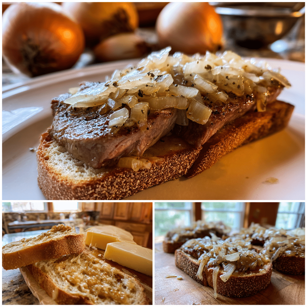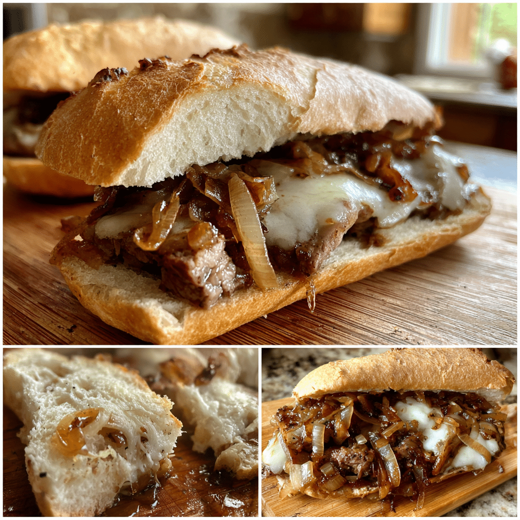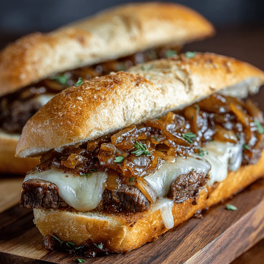 A hearty sandwich featuring juicy seared steak, caramelized French onion gravy, and melted cheese layered on toasted bread.