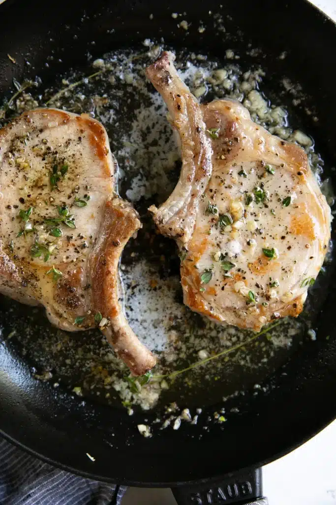 - Baste pork chops once more with pan juices.