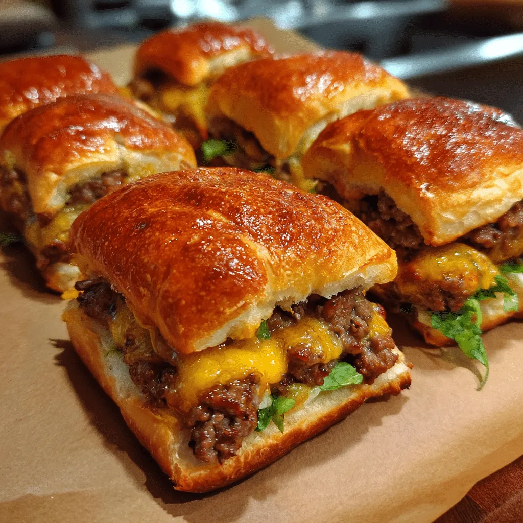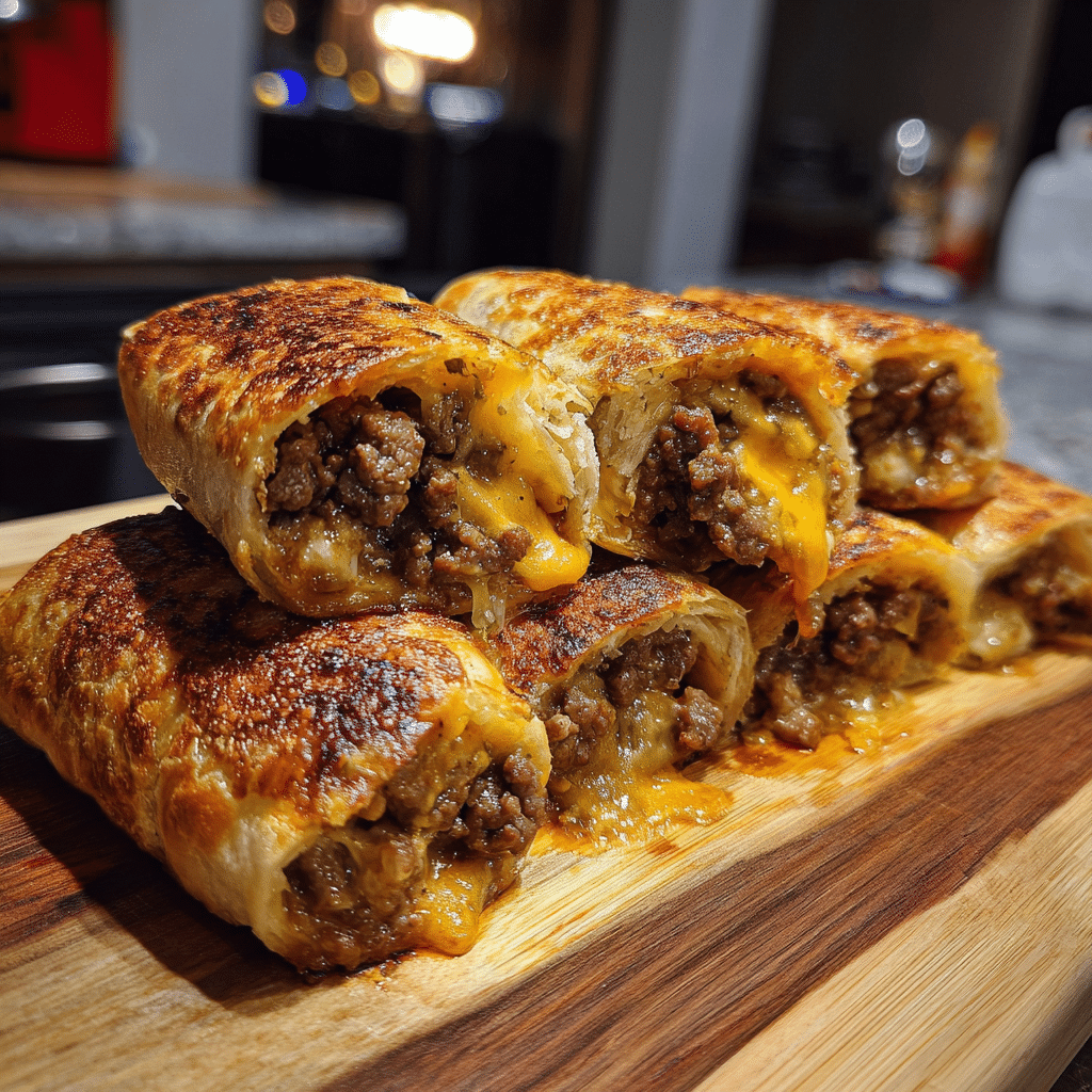 Savory rollups made with seasoned ground beef, melted cheese, and soft dough, brushed with rich garlic butter and baked until golden for an irresistible cheeseburger-inspired appetizer or meal.