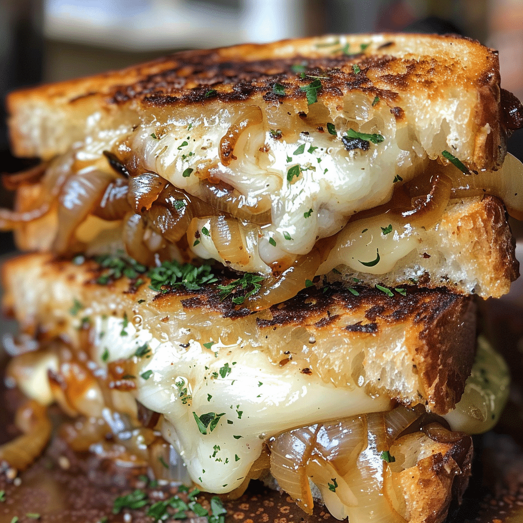 A gourmet twist on the classic grilled cheese sandwich, layered with sweet caramelized onions and gooey melted cheese for a rich, comforting bite.
