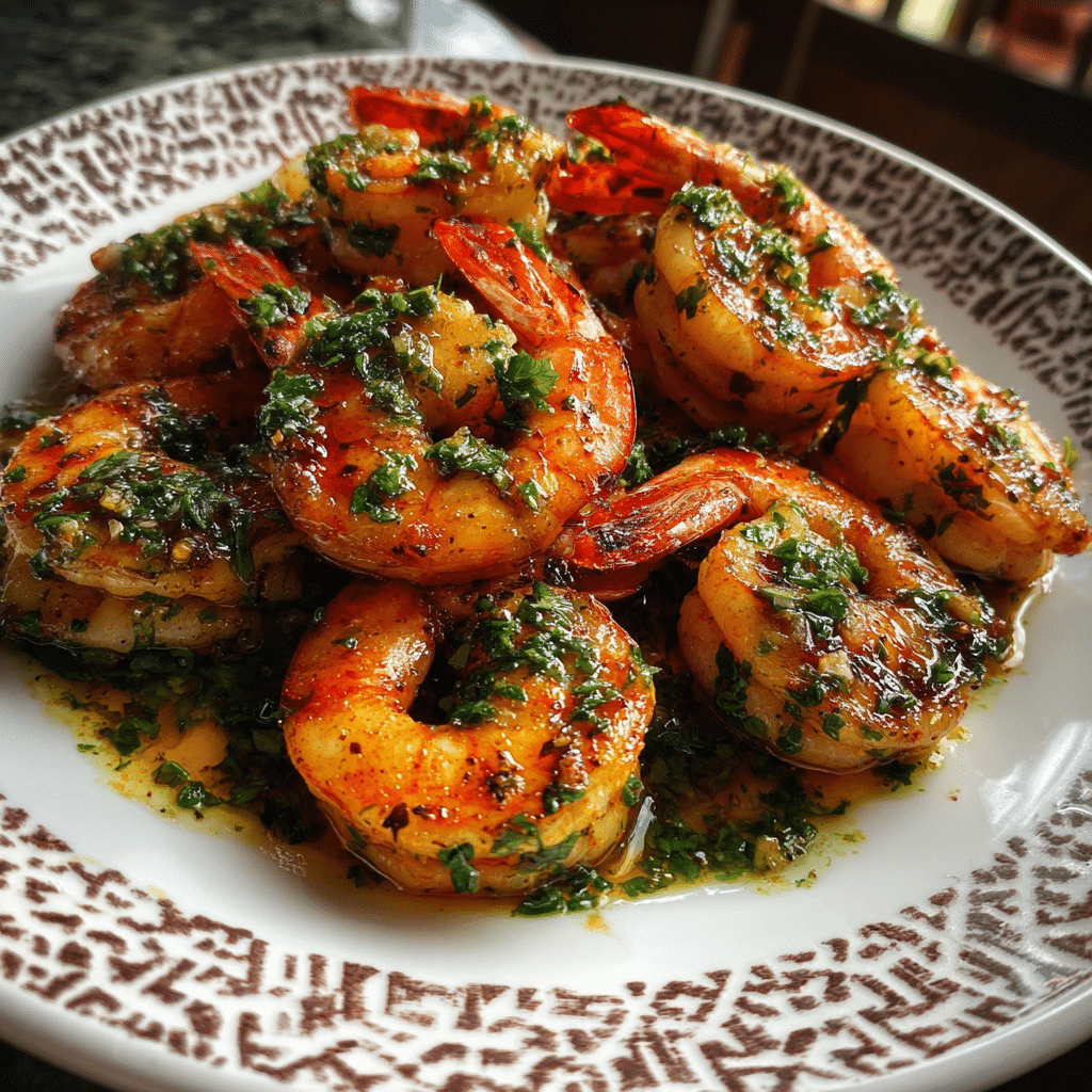Juicy grilled shrimp marinated with garlic and olive oil, then topped with a vibrant chimichurri sauce made from fresh herbs, garlic, and vinegar for a bold, fresh flavor.