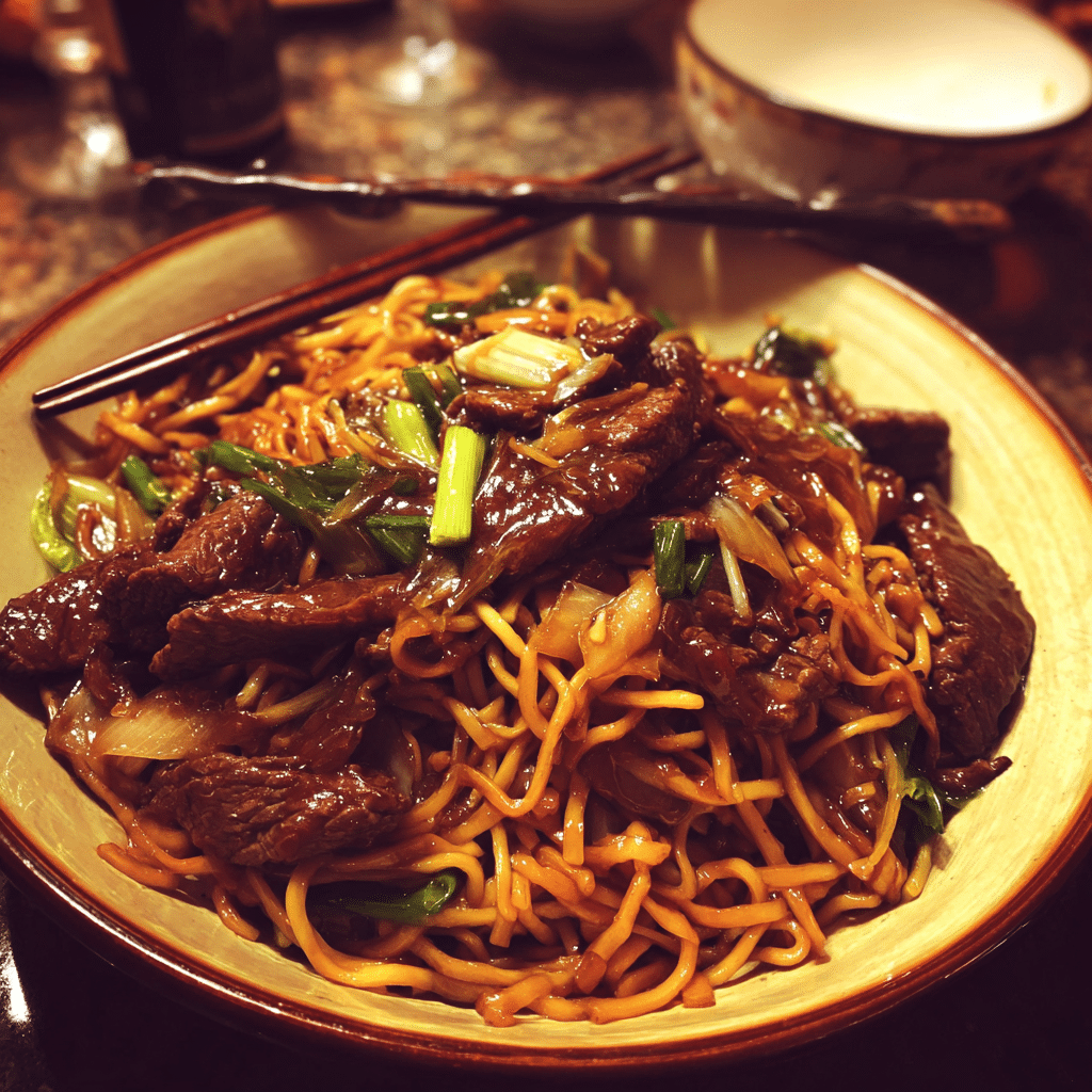 A savory-sweet Hoisin Beef Noodles dish featuring tender beef strips, chewy noodles, and a rich hoisin-based stir-fry sauce.