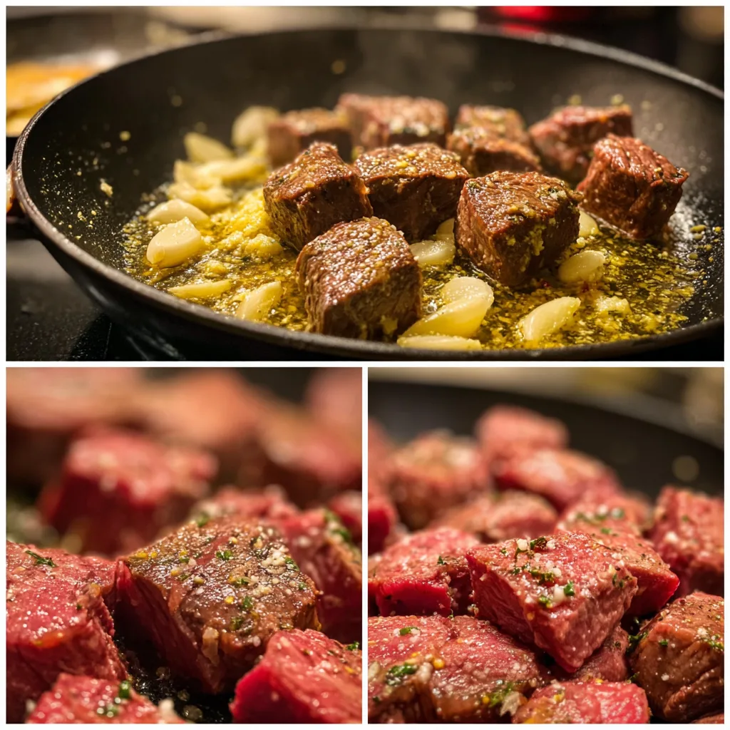 - Toss the steak bites in the garlic butter for 1–2 minutes until fragrant and well coated.