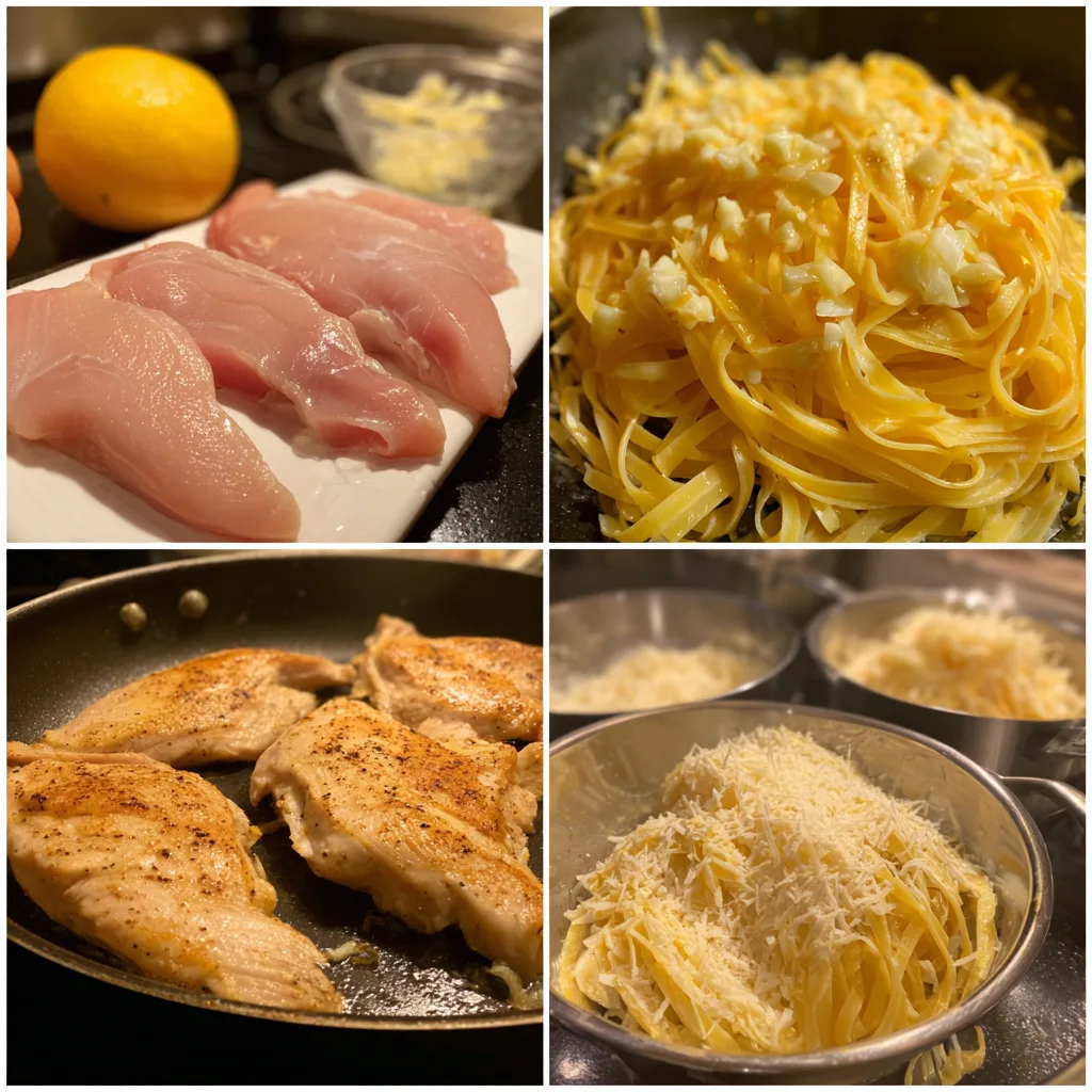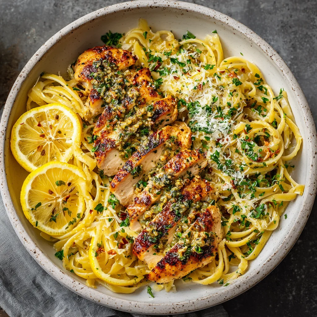 A rich and flavorful dish featuring juicy lemon garlic butter chicken served over creamy parmesan linguine, perfect for a comforting and elegant meal.