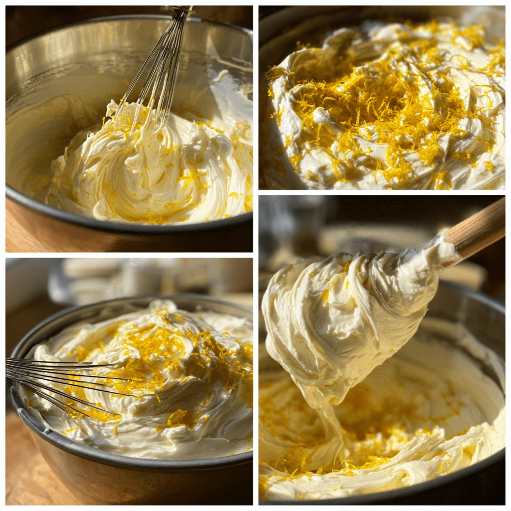 To prepare the frosting, beat cream cheese and butter until smooth. Gradually add powdered sugar and mix until fluffy. Stir in fresh lemon juice and zest until fully incorporated.