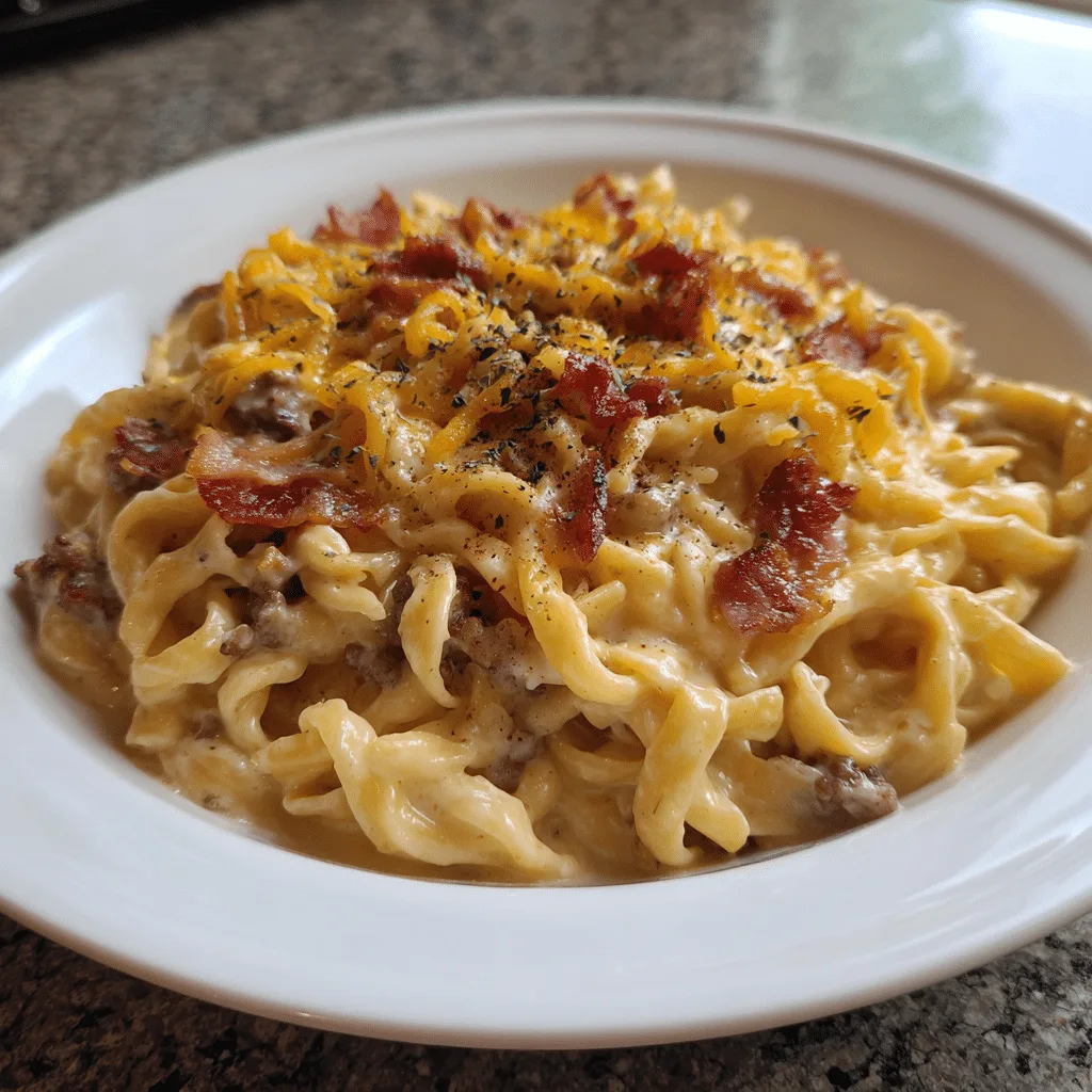 A decadent fusion of a classic bacon cheeseburger and creamy Alfredo pasta, loaded with ground beef, crispy bacon, melted cheese, and a rich Alfredo sauce for the ultimate comfort food dish.