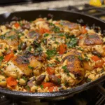 Mediterranean Chicken and Orzo Skillet is the kind of meal that makes weeknight cooking both simple and exciting. It’s hearty, colorful, and full of flavor, yet it only takes one pan to prepare—making cleanup effortless. Tender chicken, nutty orzo, and fresh vegetables come together with Mediterranean-inspired seasonings for a balanced dish that feels wholesome and satisfying. I once swapped the chicken for shrimp, and it was just as delicious, adding a coastal flair to the meal. What I love most is how versatile this dish can be—you can adapt it with seasonal produce or different proteins, and it always works. The orzo absorbs the savory juices from the chicken and aromatics, ensuring every bite is flavorful. Whether you’re cooking for family or hosting friends, this skillet dish is both comforting and impressive.