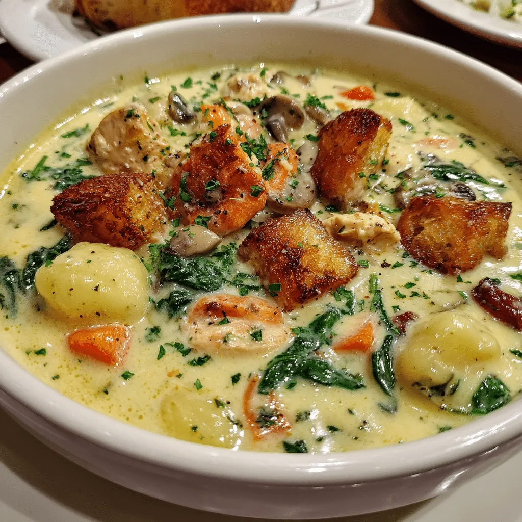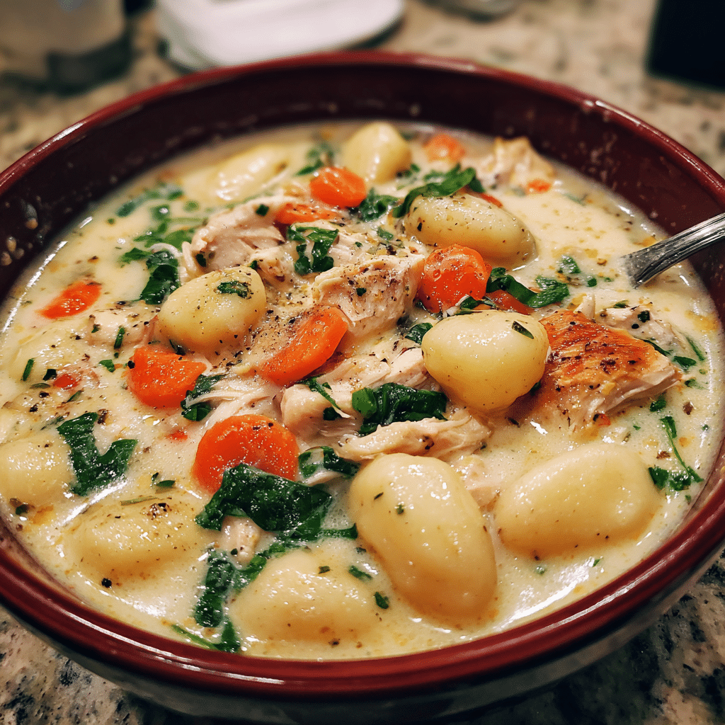 A creamy, comforting soup inspired by Olive Garden’s classic, featuring tender chicken, soft potato gnocchi, fresh spinach, and vegetables simmered in a rich, savory broth.