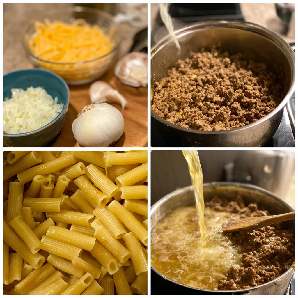 Beef broth is essential for cooking the pasta and infusing it with rich, savory flavor. It replaces water and makes a noticeable difference.
