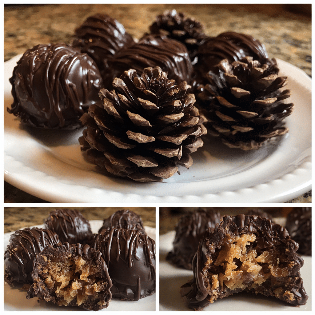 Cute and delicious no-bake chocolate truffles shaped like pinecones using a creamy chocolate base and mini cereal or sliced almonds for the scales—perfect for winter or holiday treats.