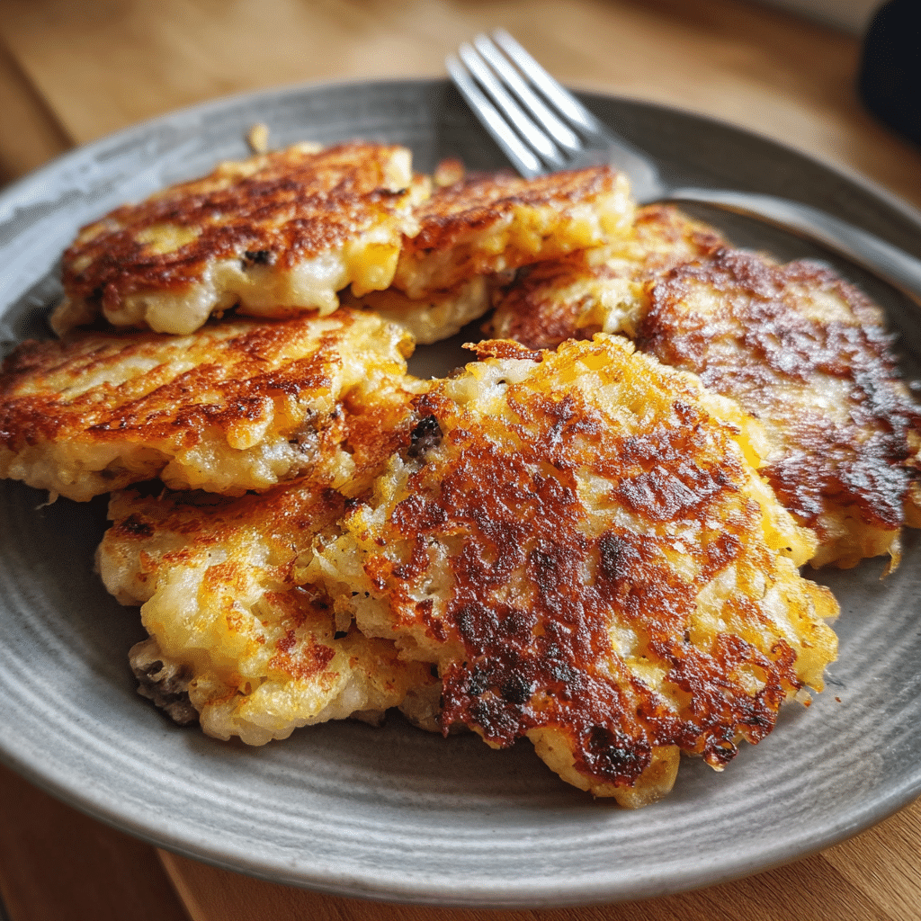 Heat oil in a skillet over medium-high heat. Drop spoonfuls of the potato mixture into the pan, flattening slightly with the back of a spoon. Fry until golden and crispy on each side, about 3–4 minutes per side. Transfer the pancakes to a paper towel-lined plate to drain excess oil.