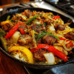 Sausage, Onion, and Bell Peppers over Rice is a simple, flavorful one-pan meal featuring savory sausage sautéed with sweet onions and colorful bell peppers, served over fluffy rice. It’s quick, filling, and perfect for weeknight dinners.