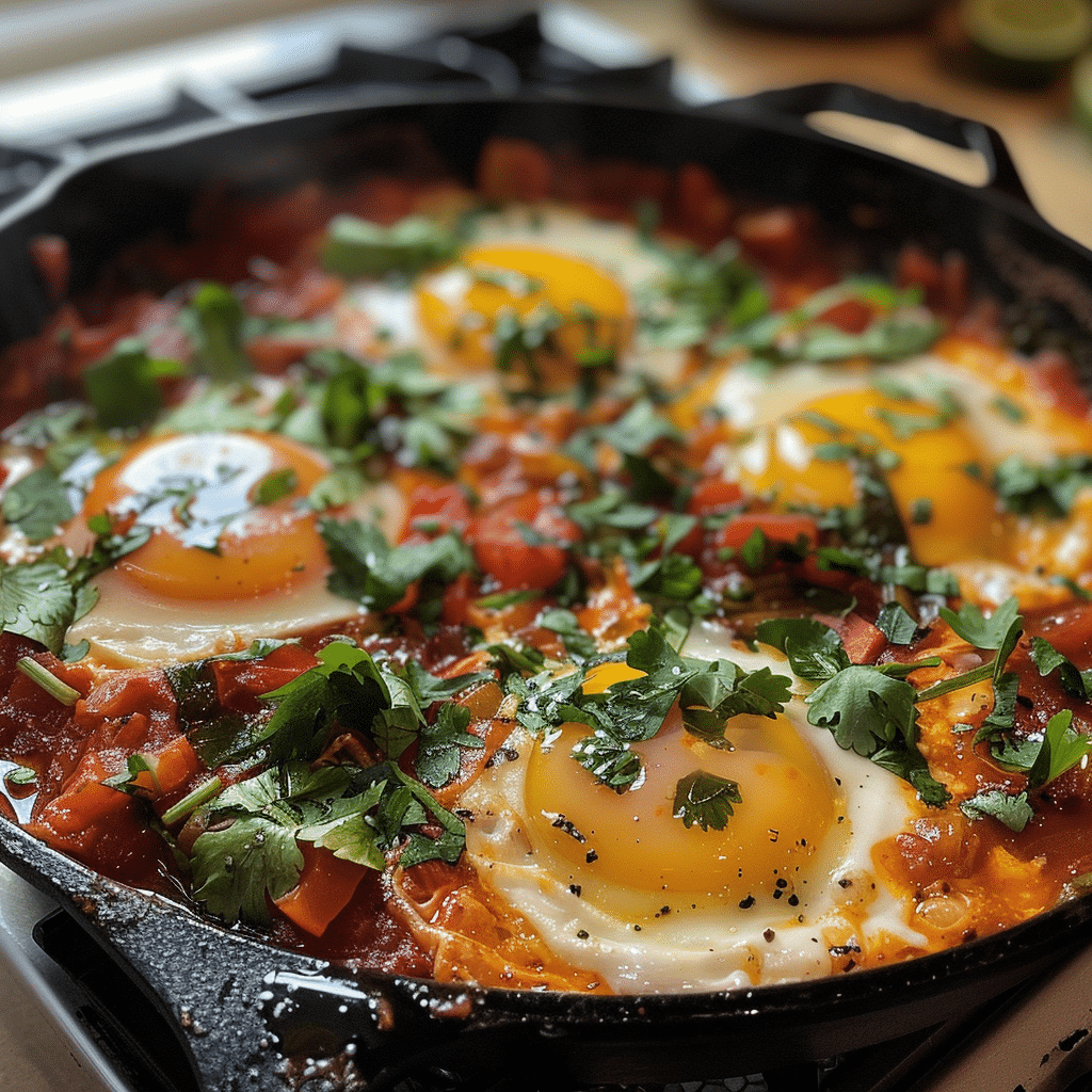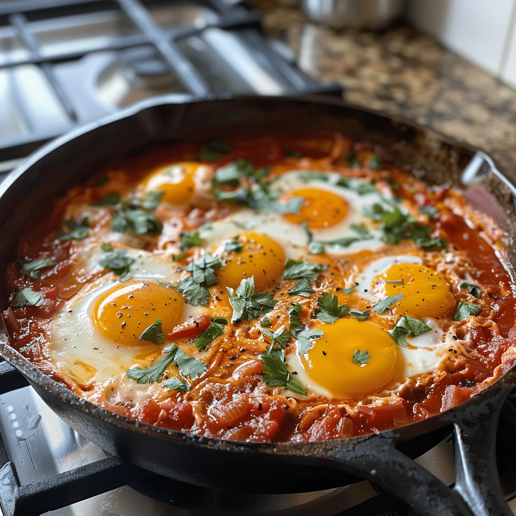 Eggs – The star of the recipe, gently poached in the sauce until the whites are set but the yolks remain soft and creamy.