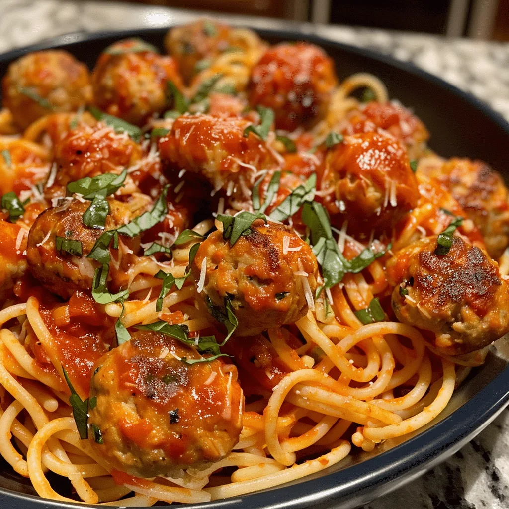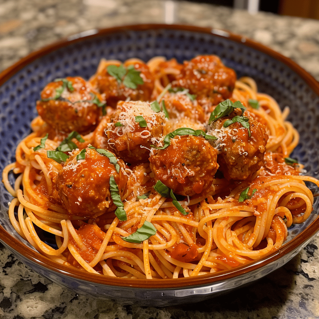 A flavorful twist on classic spaghetti and meatballs, featuring juicy turkey meatballs with a spicy kick served over tender pasta in a rich tomato sauce.