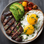 A classic, protein-packed breakfast featuring juicy steak, perfectly cooked eggs, and creamy avocado for a satisfying and hearty meal.