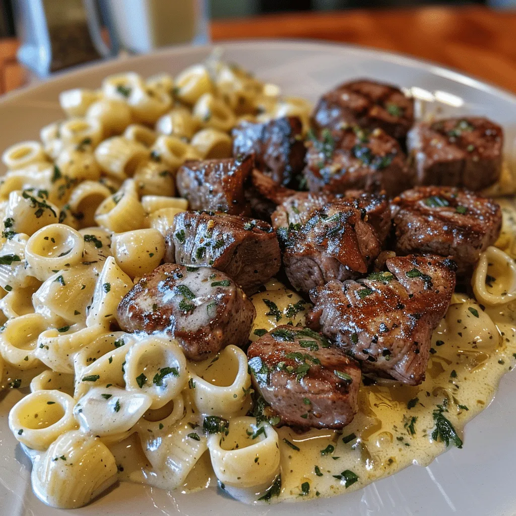 Steak Bites and Shell Pasta in Garlic Butter Alfredo