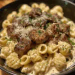 Steak Bites and Shell Pasta in Garlic Butter Alfredo is the ultimate comfort dish that combines creamy pasta and perfectly seared steak in one irresistible meal. With its velvety sauce, garlicky aroma, and buttery richness, it’s a dinner that feels indulgent yet simple to prepare. Each bite delivers the perfect mix of savory steak and creamy pasta — a harmony of flavors that will make this recipe a repeat favorite for any occasion.