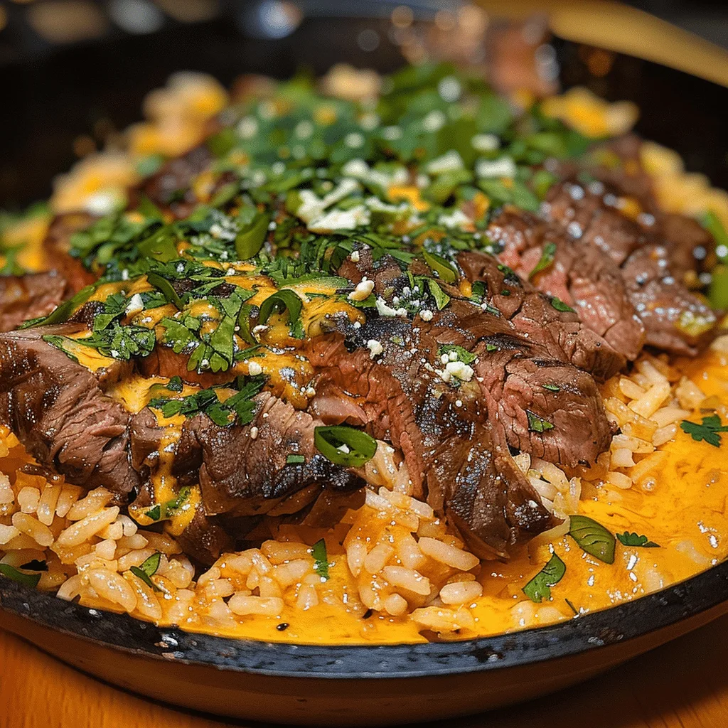 A hearty and flavorful dish featuring juicy steak served over cheesy rice with queso sauce, perfect for a comforting and satisfying meal.