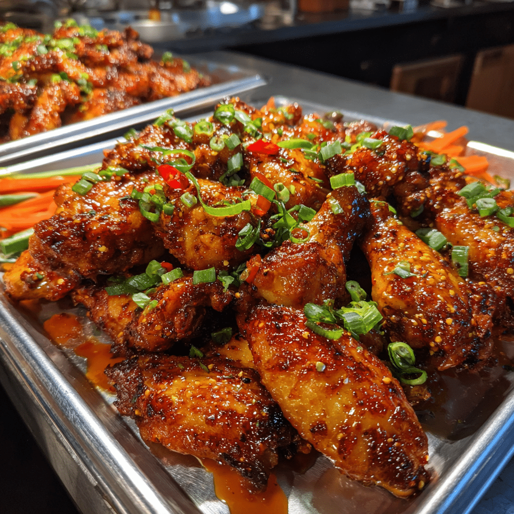 While the wings cook, prepare the sauce. In a saucepan, combine soy sauce, honey, brown sugar, garlic, ginger, hot sauce, rice vinegar, sesame oil, and chili flakes. Simmer gently until slightly thickened. Stir in a cornstarch slurry to achieve a glossy, sticky consistency.