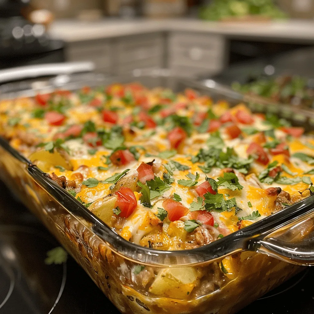 Begin by preheating your oven to 375°F (190°C) and lightly greasing a large baking dish. In a skillet over medium heat, cook the ground beef until browned, breaking it up with a spoon. Add the chopped onions and bell peppers, cooking until softened. Stir in taco seasoning and diced tomatoes, letting the mixture simmer for a few minutes to meld the flavors.